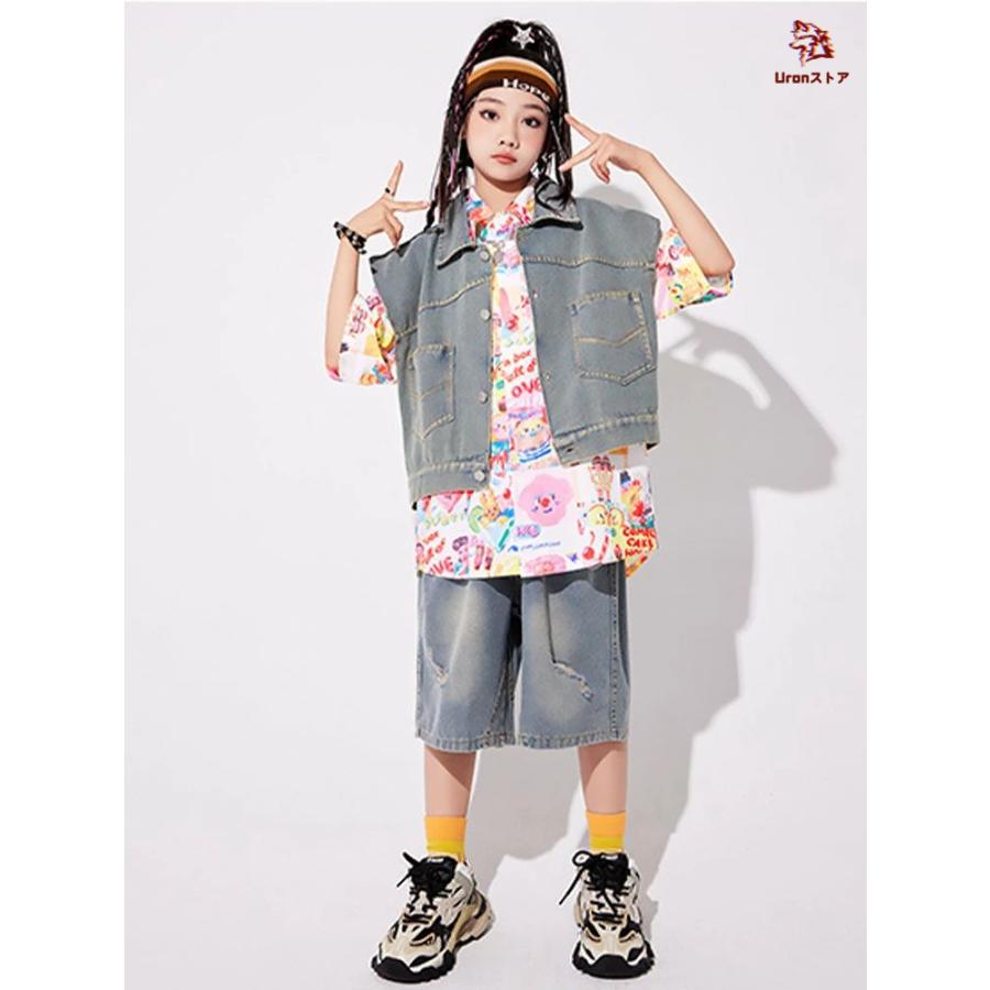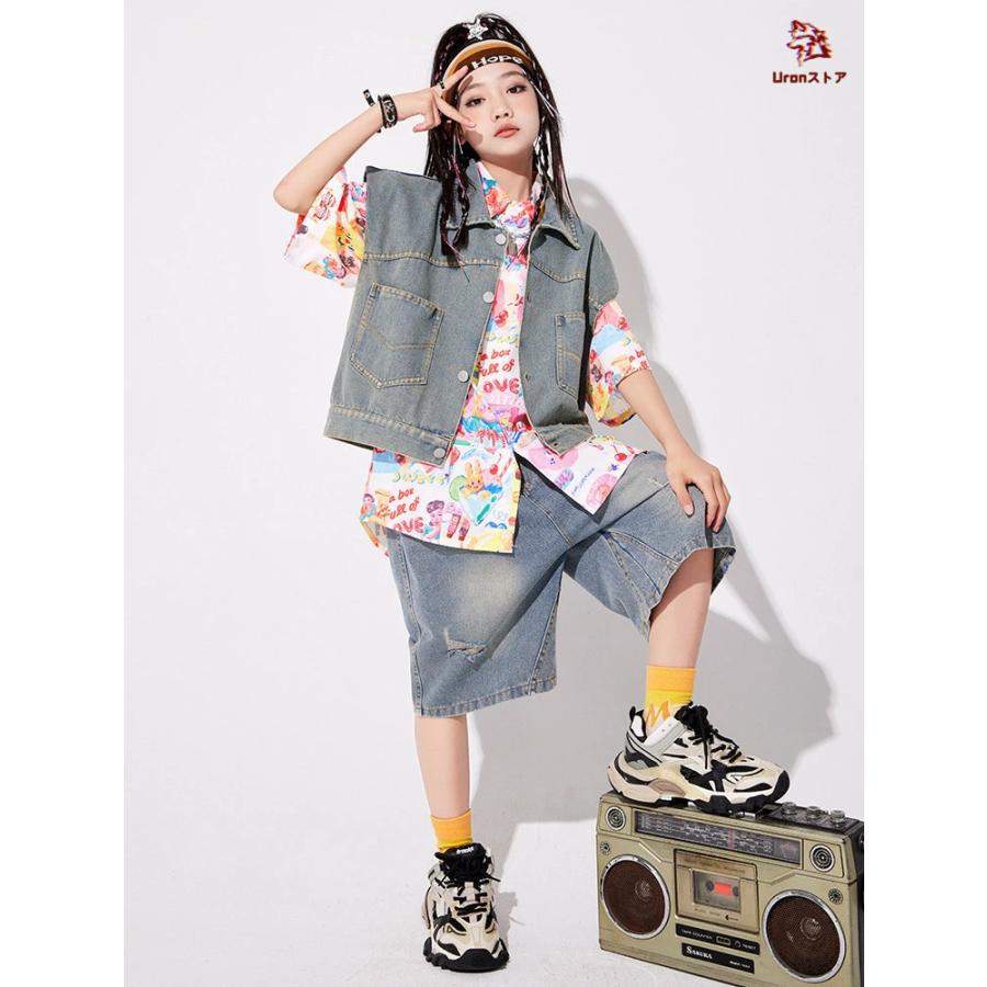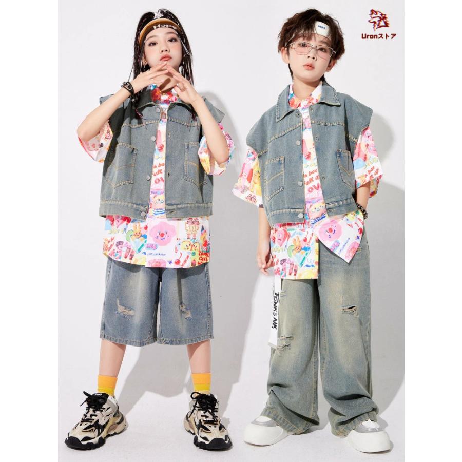 デニムベスト シャツ デニムパンツ 半ズボン ダメージジーンズ 女の子 男の子 韓国k-pop jazz HIP-HOP 半袖シャツ ゆったり かっこいい カジュアル ブルー 総柄