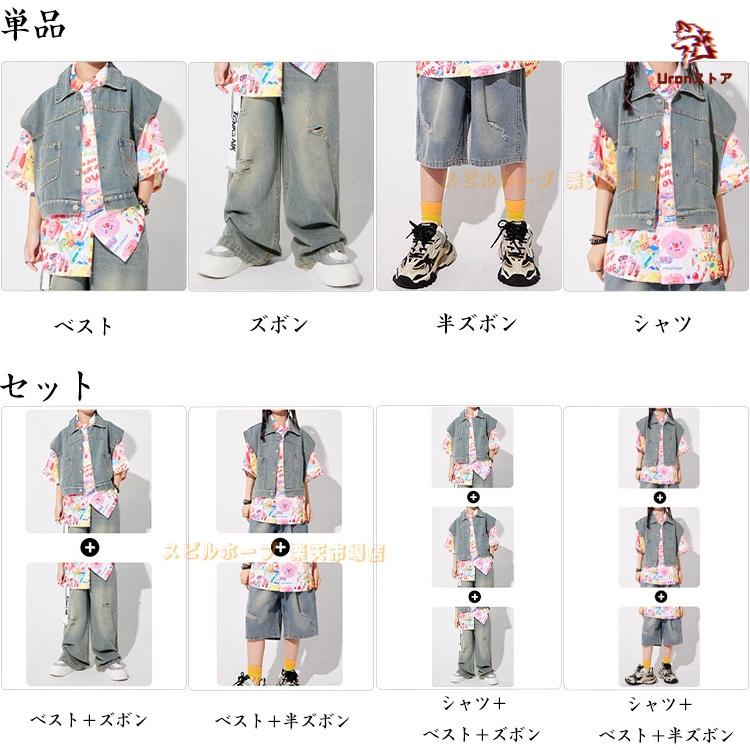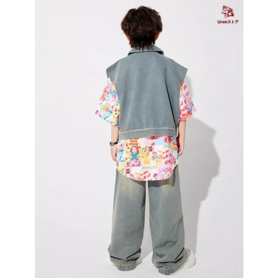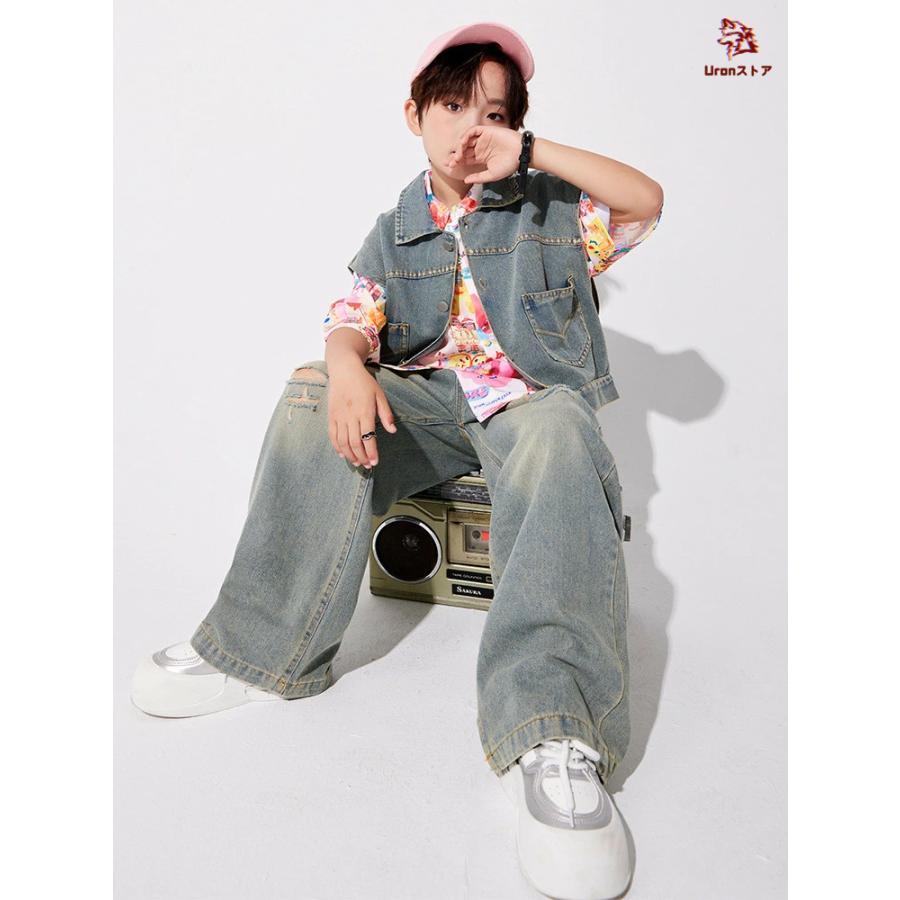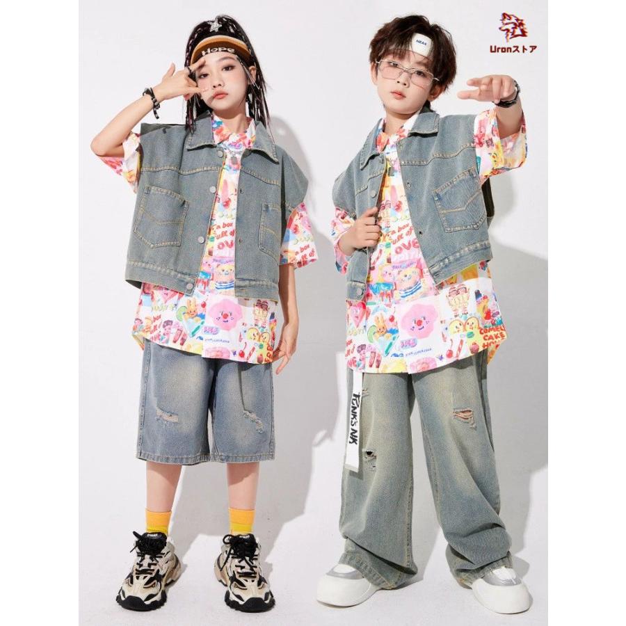 デニムベスト シャツ デニムパンツ 半ズボン ダメージジーンズ 女の子 男の子 韓国k-pop jazz HIP-HOP 半袖シャツ ゆったり かっこいい カジュアル ブルー 総柄