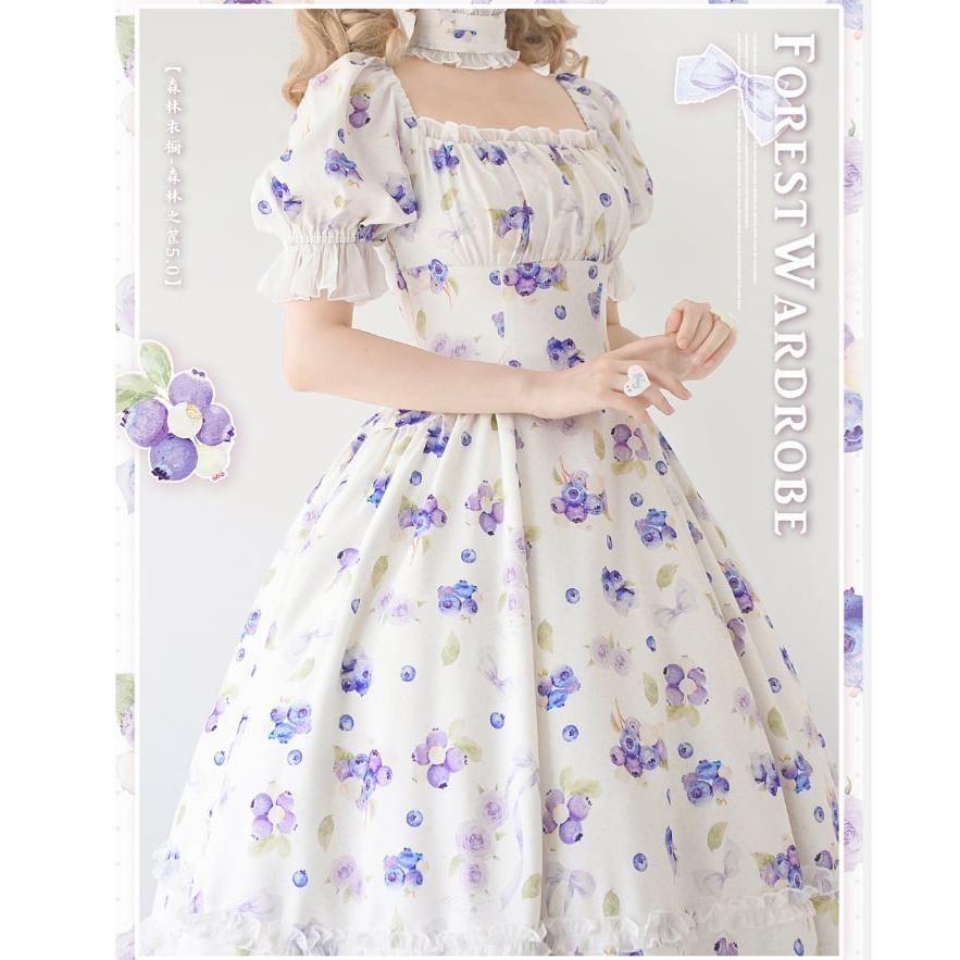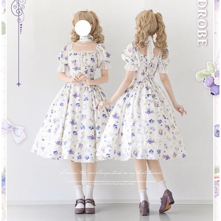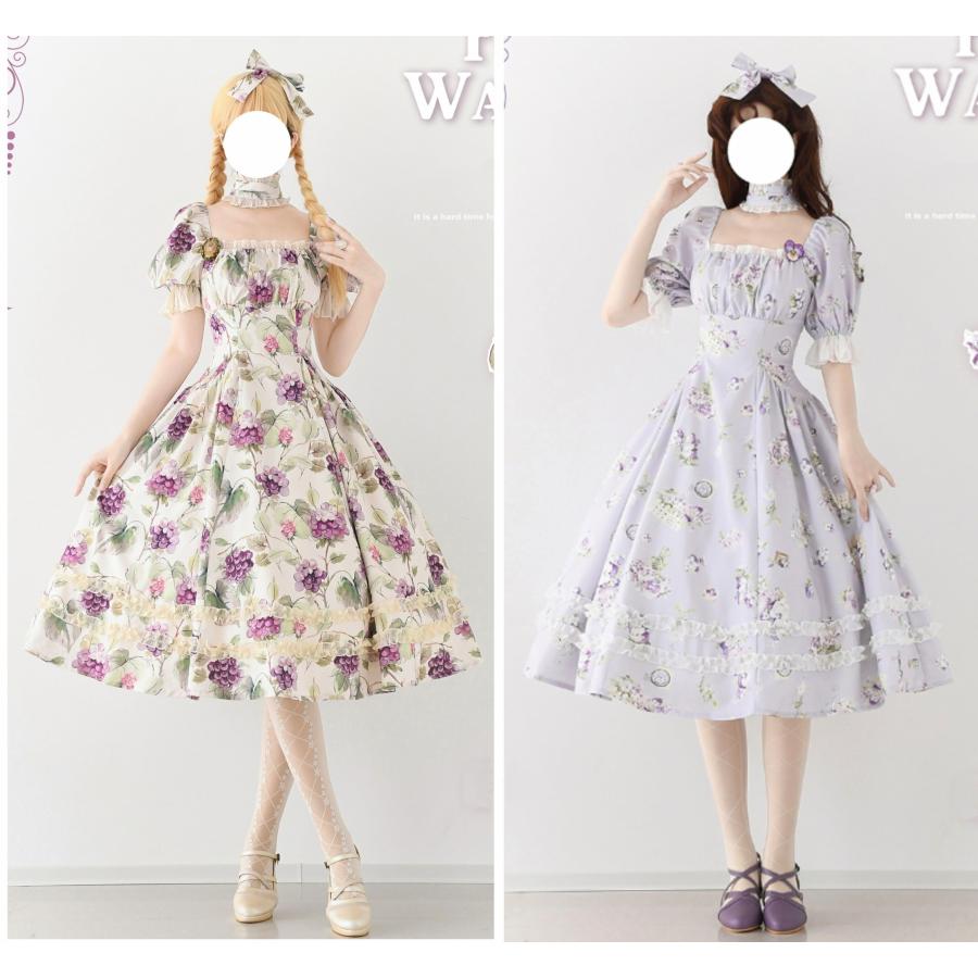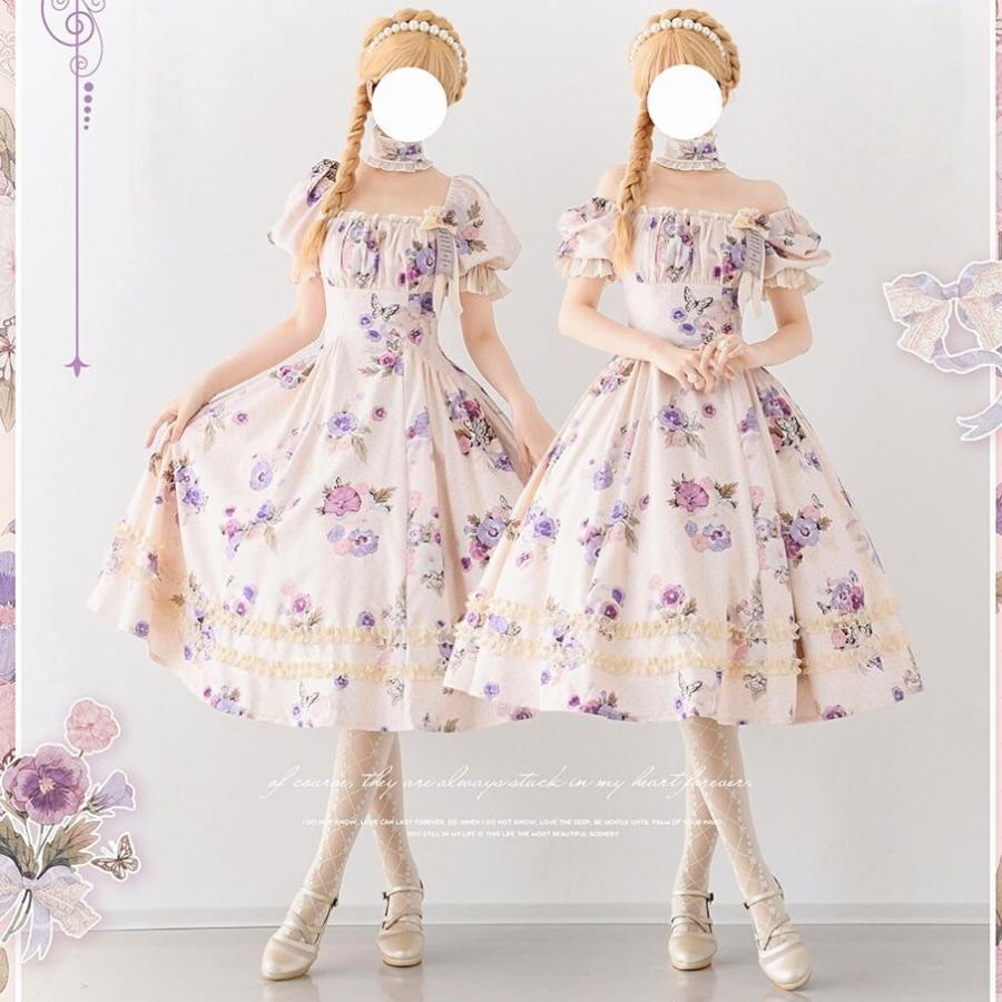 ロリータ 総柄 半袖ワンピース 付け襟 2way 6color