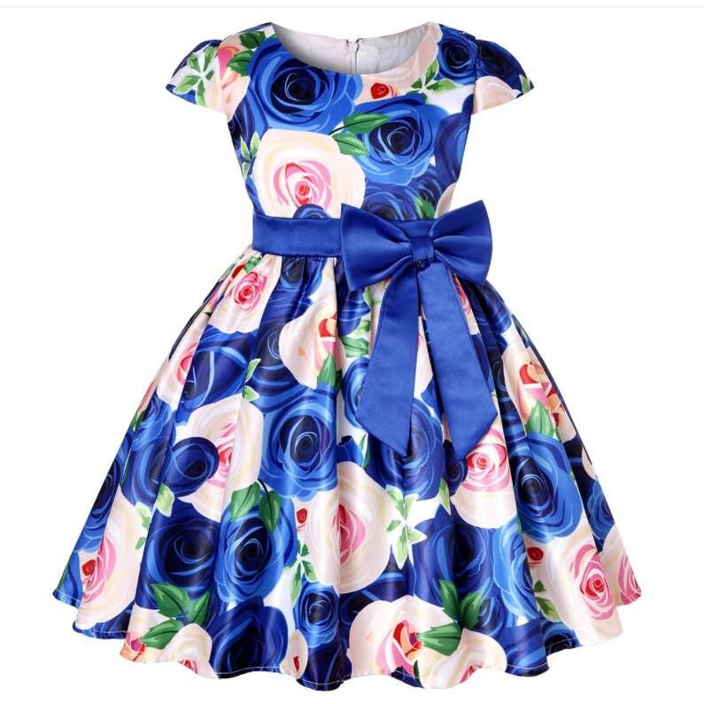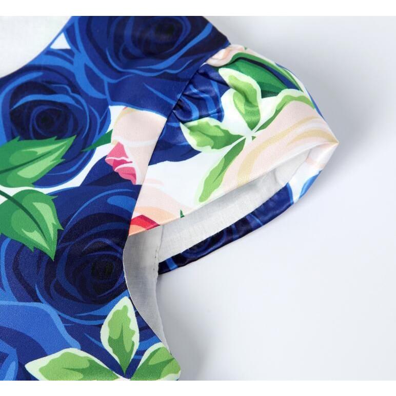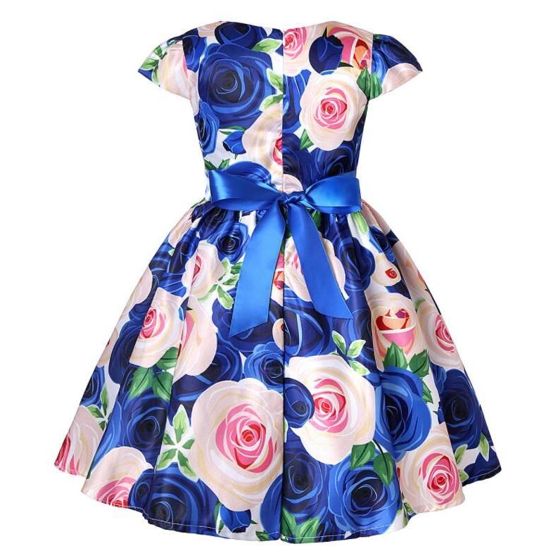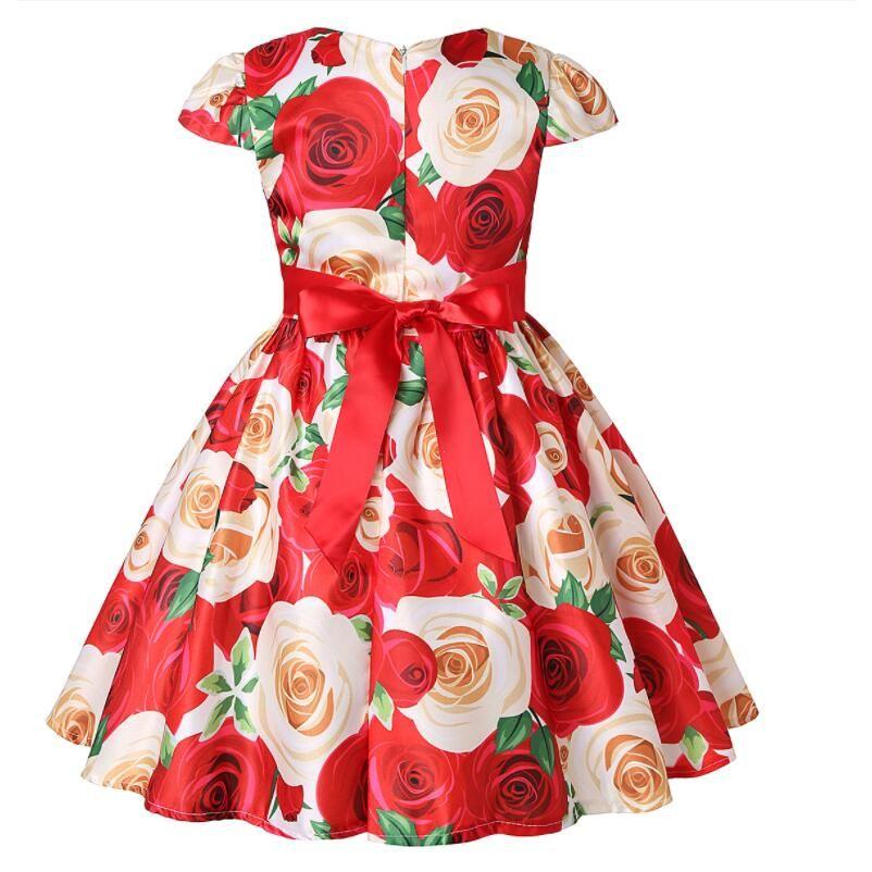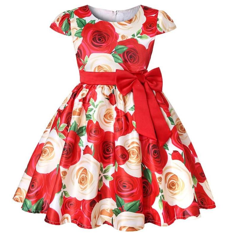 子供 ワンピース キッズ ドレス 膝丈 ミモレ丈 お姫様 大きい花柄 薔薇花 総柄 ウエストにリボン キャップ スリーブ 半袖 Aライン 可愛い 女