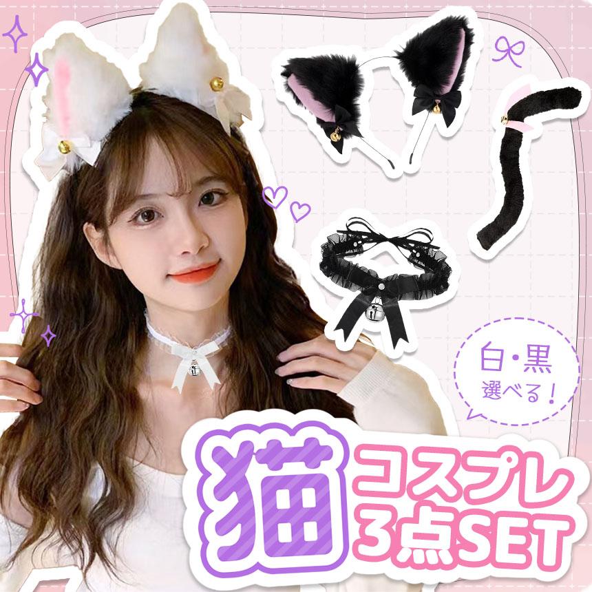白・黒選べる コスプレ 3点セット 衣装 猫 大人 子ども ハロウィン 仮装 コス ねこ 猫耳 カチューシャ チョーカー 首輪 しっぽ 尻尾 かわいい